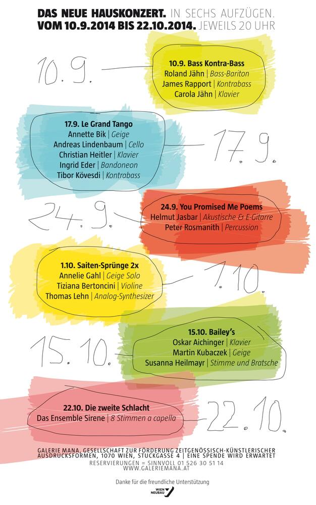 In den 1980er Jahren veranstaltete der Schmuckkünstler Florian Wagner als Begleitprogramm zur bildenden Kunst, eine Konzertreihe in seiner Galerie Mana im Wiener Siebensternviertel – und etablierte sie als gefragten und viel frequentierten "Ort für aktuelle Musik". Häufiger Besucher war damals der Pianist und Komponist Oskar Aichinger. 2011 haben Wagner und Aichinger das kleine Musikfestival in der Schmuckgalerie unter dem Titel "Das neue Hauskonzert" mit Erfolg wiederbelebt. Der "rote Faden" bei der Programmierung des Festivals seien sie selbst, sagen Florian Wagner und Oskar Aichinger. Die stilistische Bandbreite reicht von Kammerjazz über Kunst-Pop bis hin zu Neuer Musik. Wichtigster Parameter sei dabei die musikalische Interaktion. Statische elektronische Darbietungen sind in der Galerie Mana ebenso