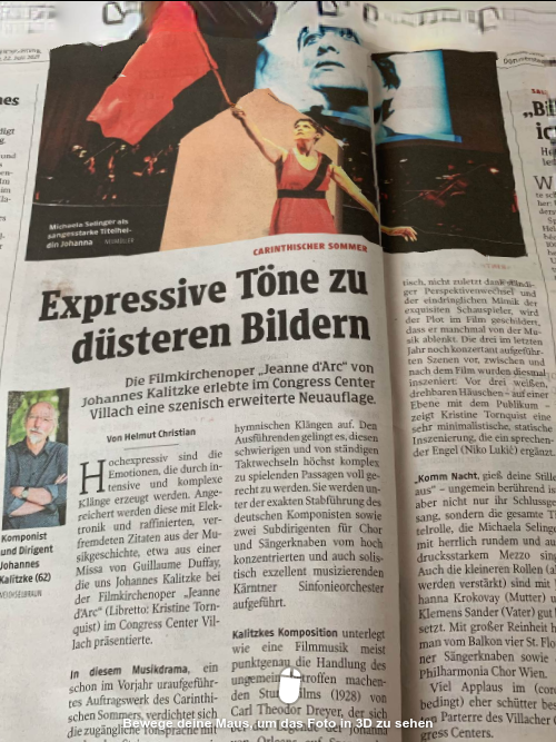 Hochexpressiv sind die Emotionen, die durch intensive und komplexe Klänge erzeugt werden. Angereichert werden diese mit Elektronik und raffinierten, verfremdeten Zitaten aus der Musikgeschichte, etwa aus einer Missa von Guillaume Duffay, die uns Johannes Kalitzke bei der Kirchen-Filmoper „Jeanne d’Arc“ (Libretto: Kristine Tornquist), ein schon im Vorjahr uraufgeführtes Auftragswerk des Carinthischen Sommers, im Congress Center Villach präsentierte.