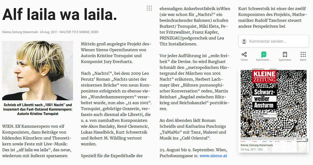 Nach "Nachts!", bei dem 2009 Leo Perutz' Roman "Nachts unter der steinernen Brücke" von neun Komponisten erfolgreich zu ebenso vielen "Wunderkammeropern" verarbeitet wurde, nun also "11 aus 1001". Tornquist, gebürtige Grazerin, verfasste auch diesmal alle Libretti, die u. a. von namhaften Komponisten wie Akos Banlaky, René Clemencic, Lukas Haselböck, Kurt Schwertsik und Robert M. Wildling vertont wurden.