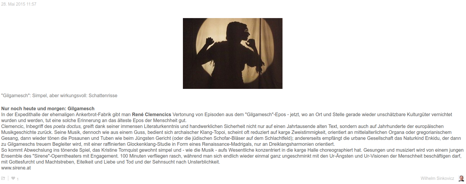 In der Expedithalle der ehemaligen Ankerbrot-Fabrik gibt man René Clemencics Vertonung von Episoden aus dem "Gilgamesch"-Epos - jetzt, wo an Ort und Stelle gerade wieder unschätzbare Kulturgüter vernichtet wurden und werden, tut eine solche Erinnerung an das älteste Epos der Menschheit gut.